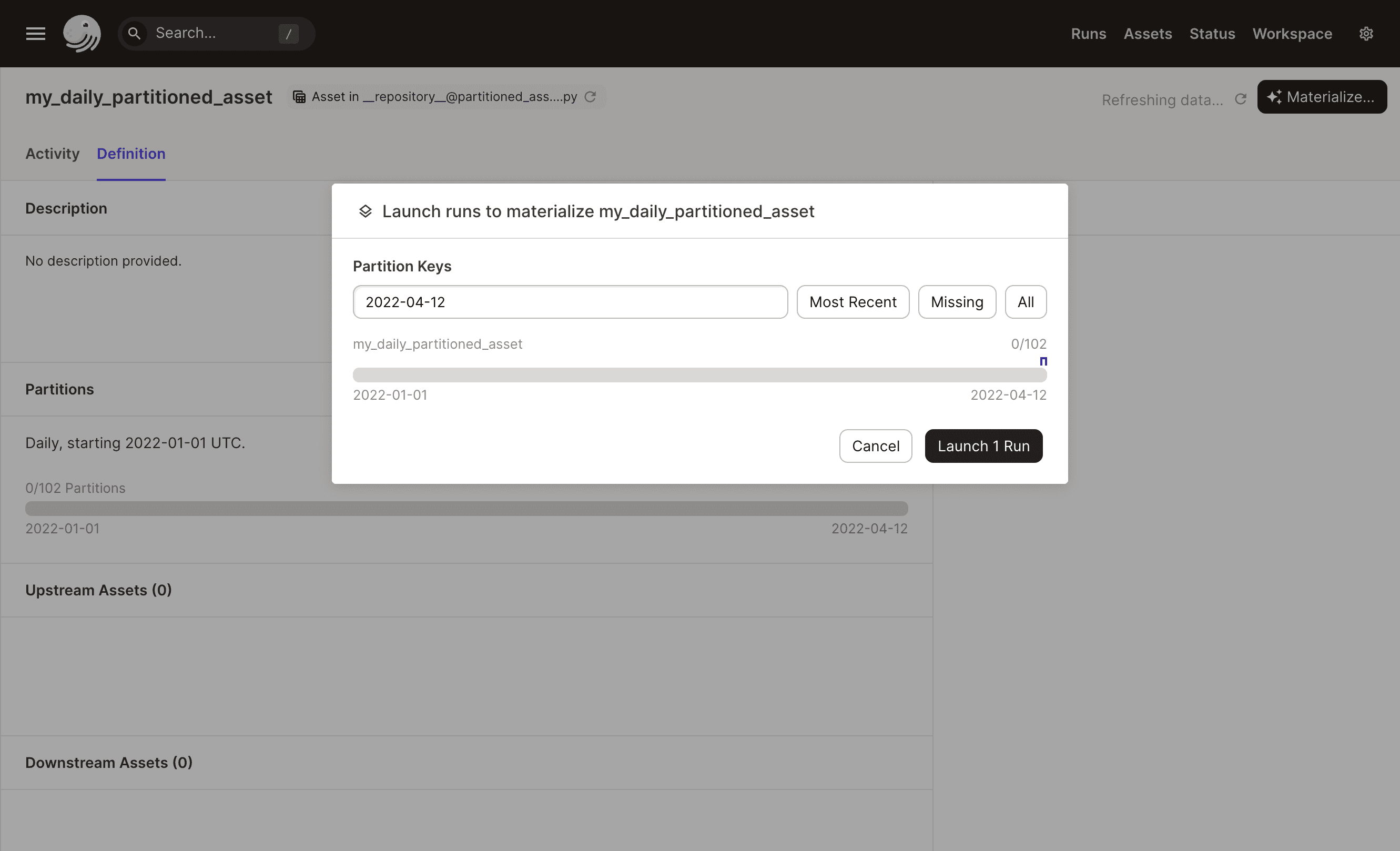 When you materialize a partitioned asset, you choose which partitions to materialize, and Dagster will launch a run for each partition.